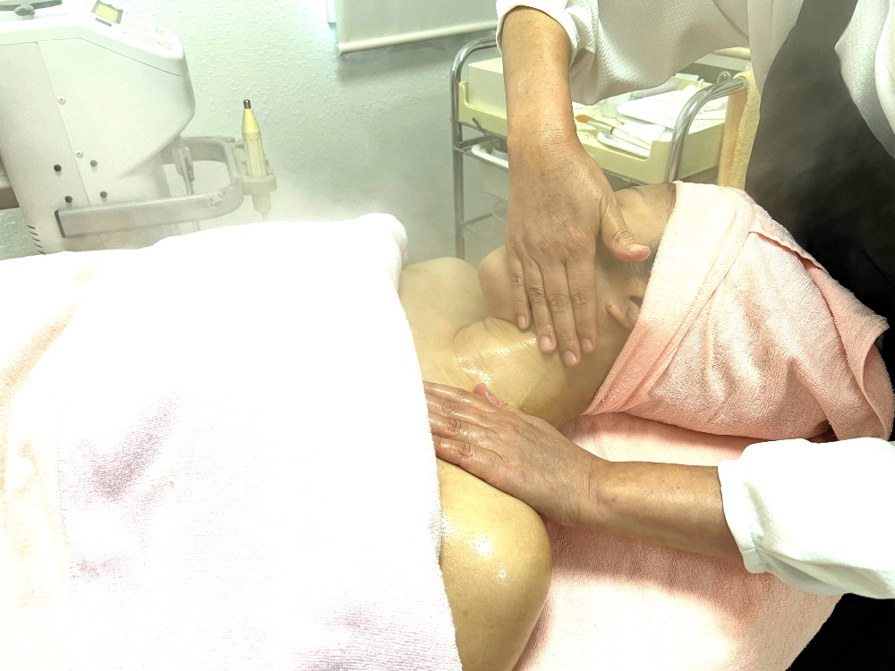 オプションでデコルテ希望されるとお顔のマッサージの前にデコルテが入ります。
