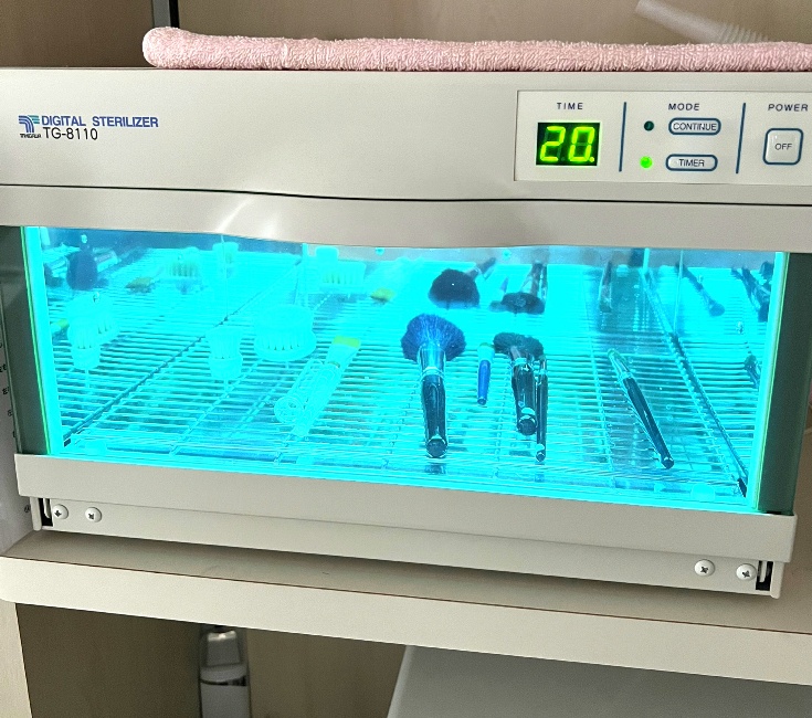 使用したエステ用器具、メイクブラシ、ヘッド用ブラシは良く洗浄し消毒しています。