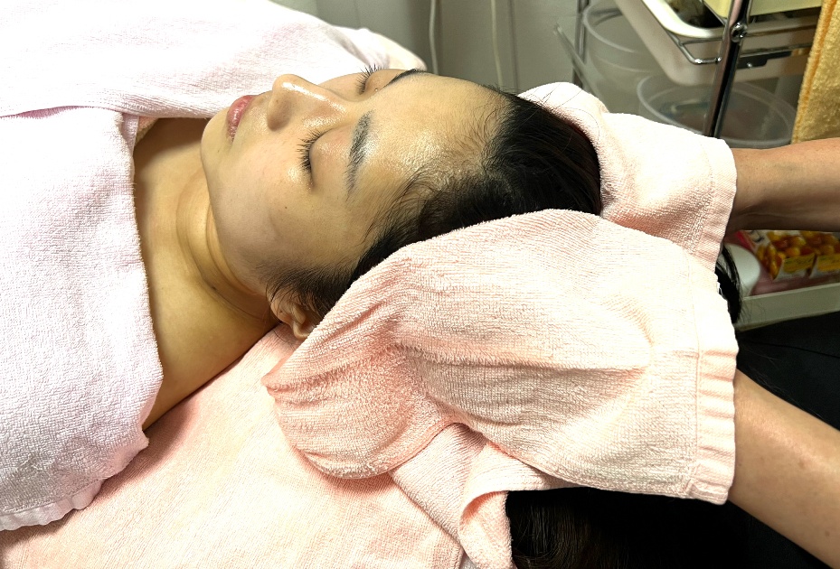 オプションのヘッドマッサージご希望の方は、整肌の後に行います
